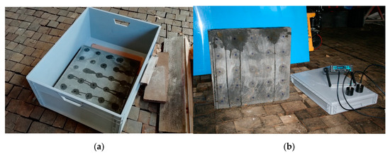 Figure 5. Testing of the influence of rainwater on the results of the measurement using the ultrasonic method. (a) The V3 slab in container, prepared for rainfall simulation, (b) the V3 slab measurements.