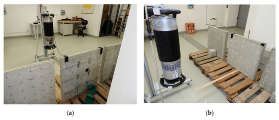 Test plates ready for radiography. (a) Testing Slab A2-2, the layout of lead orientation markings is visible on the back; (b) Testing Slab A2-3, right X-ray YXLON SMART 300 HP, placed in a special stand allowing easy fixation of the X-ray in any position.