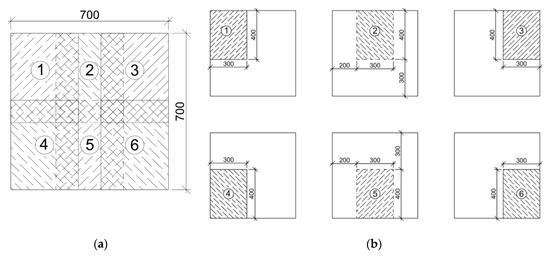 Schematic representation of the distribution of six radiograms (1 to 6) on the surface of the test plate [mm]. (a) Films assembling on the testing slab; (b) put films on the testing slab.