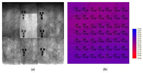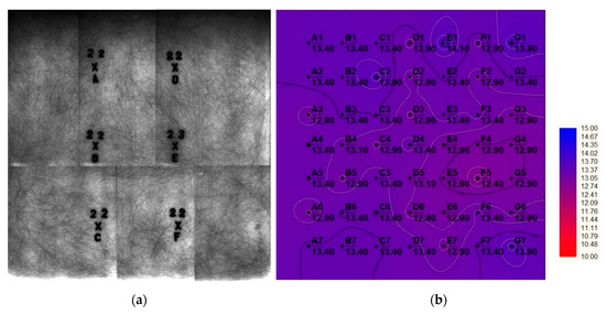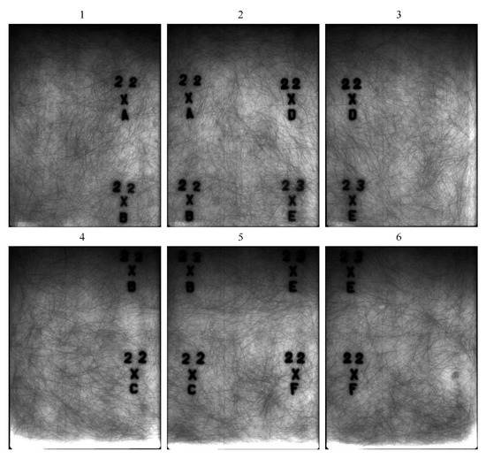 Due to the surface dimensions of the test plates 700 × 700 mm, and the dimensions of the memory foils 400 × 300 mm, the area of the test plate was always covered with six radiograms (see the diagram in Figure 7). To clearly identify the position of the radiogram within the testing slab area, lead marks were placed on the back of the irradiated slabs (closer to the memory foil), which, due to the high lead density, are clearly visible in the images regardless of the irradiation parameters. In Figure 8, there are visible radiograms that overlapped on the surface of the slab.