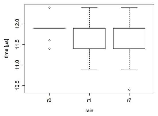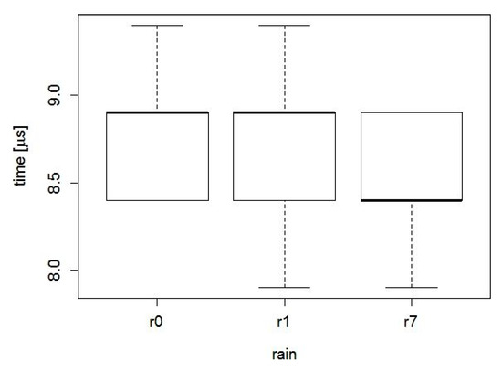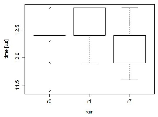 The results of the ANOVA calculation are summarized in Table 3 and in the graphical form in Figure 9, where are depicted boxplots of the ultrasonic wave transmission with respect to the factor level represented by the number of rain days (r0 = no rain, r1 = one day of rain, r7 = seven days of rain).