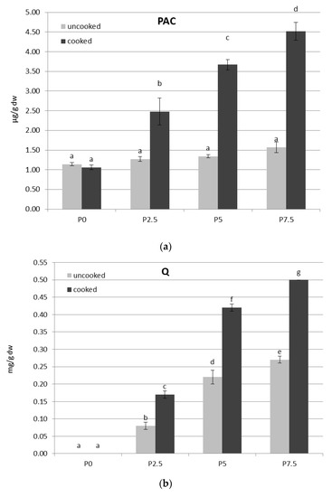 Comparison of total phenolic acid (PAC) (a), quercetin (Q) (b), and quercetin 4′-gluciside content (Q 4′ G) (c) of uncooked and cooked pastas fortified with onion skin powder. P0—control pasta; P2.5–7.5 pastas fortified with 2.5–7.5% (m/m) of onion skin powder. Different letters indicate significant difference (p < 0.05).