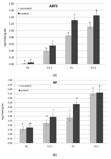 High phenolic content, like that observed in OS as an ingredient in pasta making, could be responsible for the high antioxidant activity of fortified pastas (Figure 2). As predicted on the basis of Q and PAC content results, cooking the pasta caused an increase in the antioxidant activity, which has been determined by three complementary methods of analysis (Figure 2). The ABTS free radical scavenging activity was significantly higher in cases of the extracts from all uncooked enriched pastas; however, the highest value of this activity for the P7.5 sample was observed. Additionally, the same observations for samples after cooking should be noted (nearly 30-fold higher ABTS antiradical activity for P7.5 sample in comparison to the cooked control pasta). A slightly stronger improvement of the reducing power (RP) was observed in samples from the fortified pastas (in comparison to the control samples). The ABTS and RP activity of extracts increased with the increase of onion skin concentration; however, the increase in CHP value was statistically not significant.