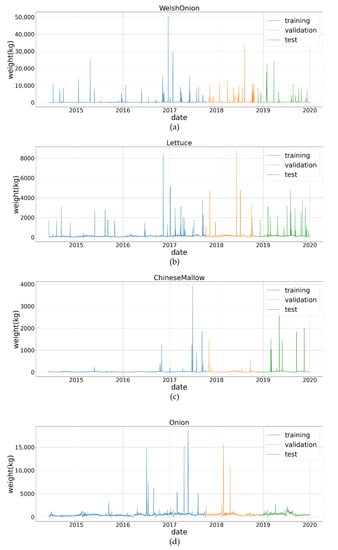The dataset used in the proposed method was extracted from a database of the sales volume of about 3000 items sold in the POS (point of sale) system of a local food retail store in Wanju, South Korea. The time-series data of five items (WelshOnion, Lettuce, ChineseMallow, Onion, and JujubeMiniTomato) that showed the least number of missing dates were chosen. The sales period for the five items was from June 2014 to December 2019, so each sales time-step was around T = 2000 days or more, where T is the total number of time-steps. Table 1 presents the sales periods and the sales days of the five items.