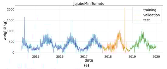 Sales volumes of five items (WelshOnion (a), Lettuce (b), ChineseMallow (c), Onion (d), and JujubeMiniTomato (e)). Note that the y-axis scale of each plot is different. The first 60% was used for the training subset (blue line), the next 20% was used for the validation subset (orange line), and the most recent 20% was used for the test subset (green line).