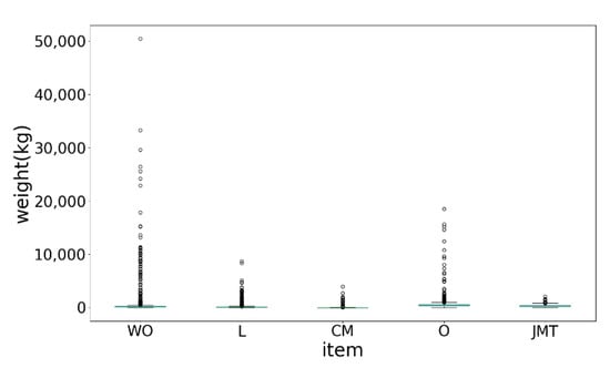 Figure 2 shows the distribution of the values in the dataset for the five items. We noticed the presence of outliers in Figure 2. Outliers result from mistakes in sales volume input, such as numerical unit errors or decimal point notation errors in sales volume.
