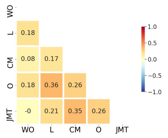 Correlation matrix among sales volumes of five items (WelshOnion (WO), Lettuce (L), ChineseMallow (CM), Onion (O), and JujubeMiniTomato (JMT)).
