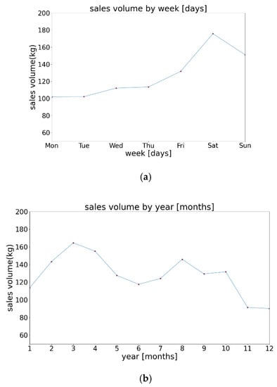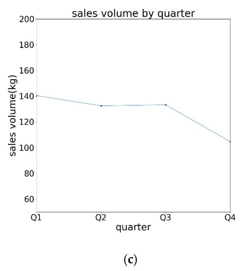 Figure 3 shows the correlation between each pair of the five items, and all correlations show weak relationships. The top-two most correlated pairs are Onion–Lettuce (0.36) and JujubeMiniTomato–ChineseMallow (0.35), while the least correlated pair is the JujubeMiniTomato–WelshOnion (0.00011). Figure 4 shows the average sales volumes by day, month, and quarter of Lettuce sales data from 1 June 2014 to 31 December 2019. Figure 4a shows that the average sales volume is the highest on Saturday, followed, in order, by Sunday and Friday. In Figure 4b, it can be seen that average sales are highest in March, followed, in order, by April and August. Figure 4c shows that average sales are in descending order of the first, third, second, and fourth quarters. Average sales in the second and third quarters are similar. As it shows a high degree of seasonality, embedding the seasonality information in the prediction models as weekly, monthly, and quarterly features is expected to improve prediction accuracy.