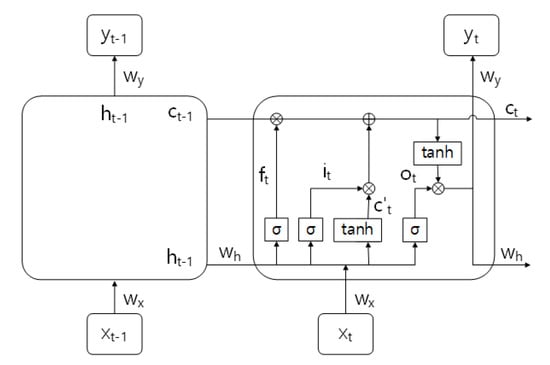 Activation functions that are commonly used in the LSTM network are sigmoid and hyperbolic tangent [12,24]. These activation functions of LSTM are calculated for forget gate , input gate , output gate , candidate vector , cell state , and hidden state using the following formulae, respectively: