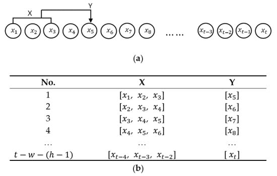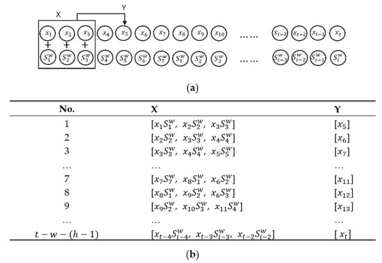 Seasonal long short-term memory (SLSTM) input data creation. (a) Data sampling with seasonality extension (, ). (b) Representation of feature vector X and label Y.