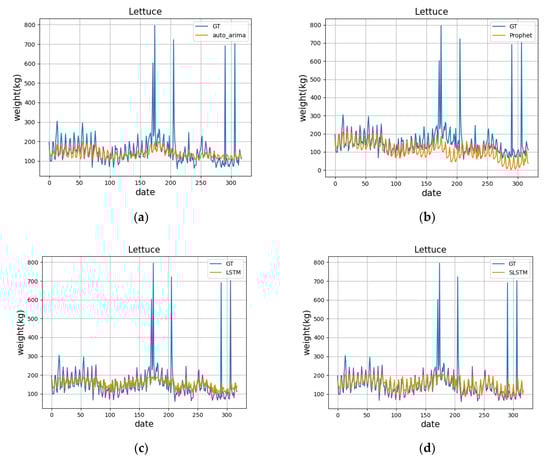 The result predicted by auto_arima (a), Prophet (b), LSTM (c), and SLSTM (d) models (only using sw) with lettuce data.