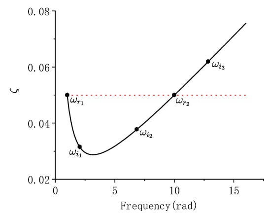 and are parameters of the Rayleigh damping method. In the Rayleigh damping method, the damping ratios of the two modes with frequency and are determined at first. and are then calculated to make sure the damping ratio of these two modes being the expected value and . When these two damping ratios are assumed to be equal, i.e., , and can be solved by Equation (14).