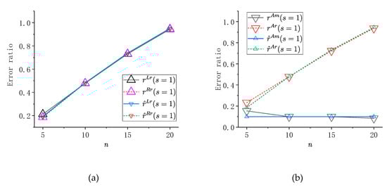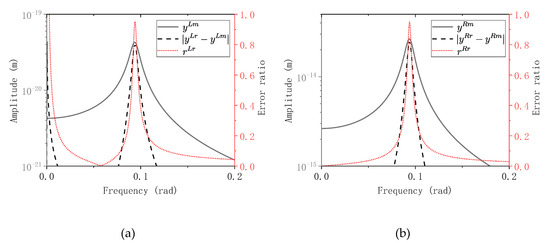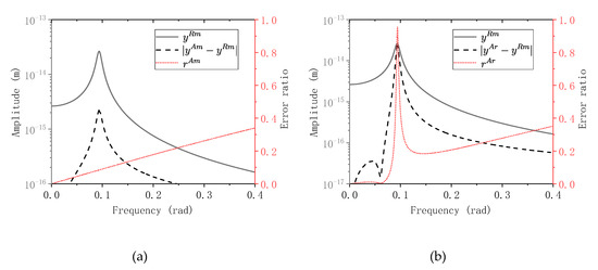When approaches infinity . It is obvious in Equation (17) that the error ratio would be smaller than for the frequencies larger than the resonance frequency. As a consequence, the error ratio at resonance frequency is a preferable value to represent the error in LMM-R. Table 2 shows examples of the value of for different parameters.