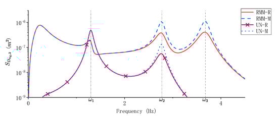 In Table 7, is obviously larger than the other responses. The response PSD of derived with the modelling methods RMM and UN are shown in Figure 12.