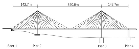 In the following context, the error in the modelling methods of a cable-stayed bridge is studied. The same analysis as the rigid frame bridge is carried out to this cable-stayed bridge. The bridge is introduced by Dyke et al. [21] and is used as a bench-mark bridge for control methods. The bridge is the Bill Emerson Memorial Bridge spanning the Mississippi River. A simplified drawing is shown in Figure 13. The detailed information of the bridge can be found in Dyke et al. [21]’s article and the data of the bridge can be found on the website [22].