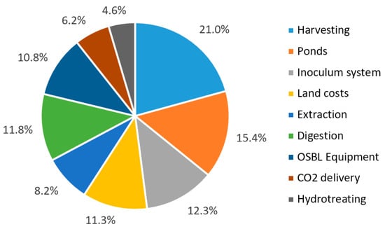 The cost structure for algae farming in open ponds and photobioreactors is shown in Figure 2 and Figure 3 (based on the investigation of [,]). The analysis shows that the capital costs for the case of open ponds are evenly distributed, while the cost of photobioreactors is dominated by the cost of construction (79% to 82.7%).
