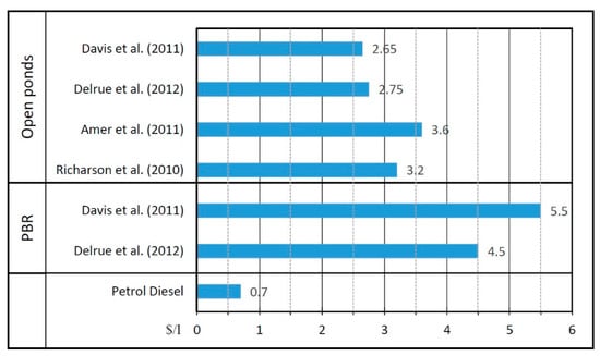 Most studies agree that the production of algal biodiesel is an energy-intensive process [,,]. Thus, the current systems for algae biodiesel production are not energy sustainable, that is, they result in a negative energy balance []. As an indicator of the energy sustainability of a product’s production, energy efficiency factor (EER) is used, which is defined as the ratio of energy produced and energy intake. EER higher than one indicates the net positive energy produced, and vice versa. The EER values are greater than one in the production of biodiesel from oilseeds [], as depicted in Table 3.