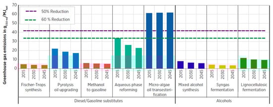 GHG emissions of advanced biofuel are depicted in Figure 5. The dashed lines show a 50% to 60% reduction of GHG emissions to a reference value of fossil fuel of 87.1 g CO2 eq./MJ []. Better conversion efficiency is the cause of the reduction in GHG emissions. The transesterification of micro-algae currently produces the highest emissions above 60 gCO2 eq./MJ fuel.