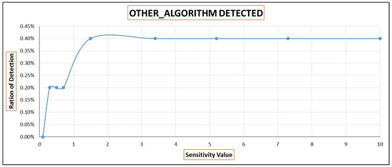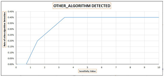 Figure 6 shows that there was no effect of the sensitivity between 0.1 and 0.7 on the results for other algorithm detected, then between 1.5 and 10.0 there was a minor increase in the detection of other algorithms by the tool. However, between 3.4 and 10.0 the tool (stegdetect) maintain a constant detection ratio for other algorithms.