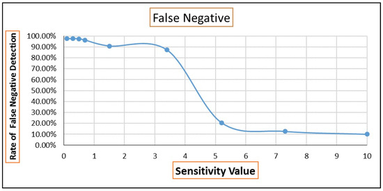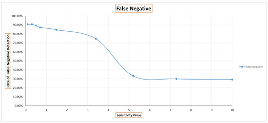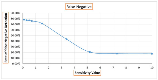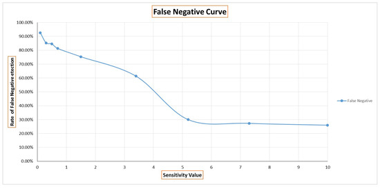 The highest was again at the beginning of the experiment was the false negative ratio 90.67%, which is much different from the previous experiment, and had a further drop with increasing sensitivity. Figure 11 shows that the curve is not different from the previous experiment.