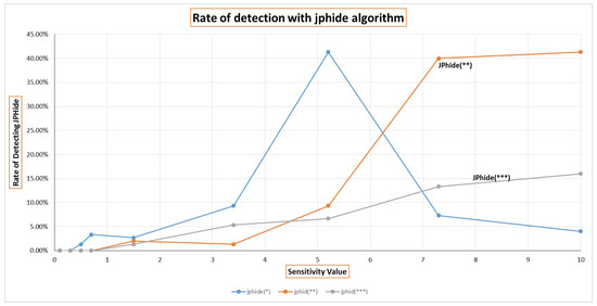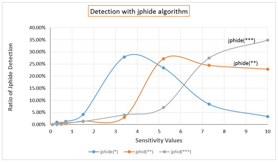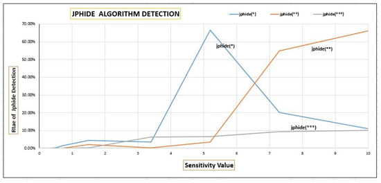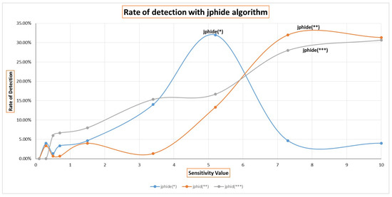 The detection results for jphide (***) from google safe (OFF) is different from the results from the safe (NO) results. With the safe (off) detection of jphide (***) started and continuous to increase between (1.5 and 10), but detection for jphide (***) in safe (ON) started between (0.5 and 10.0), and jphide (*) continuous to increase in detection between 0.5 and 5.2 before the detection started to fall has sensitivity increase between 7.3 and 10.0. Finally, jphide (**) results at 1.5–5.2 sensitivity there was a steady increase before a quick and continues increase between 7.3 and 10.0. The two image groups were compared to show how the properties of images can affect the detection of Jphide method in images. Figure 12 gives a graphical representation of the jphide results.