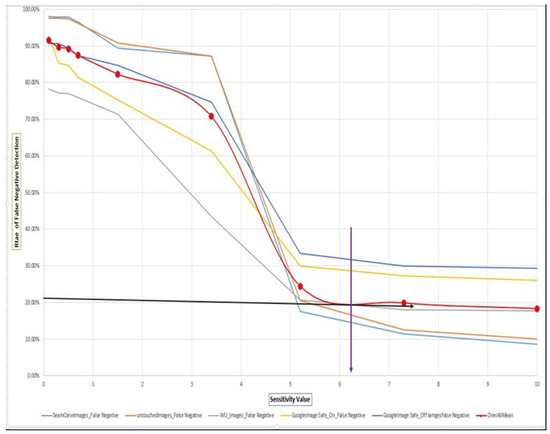 Figure 13 below present the overall false negative ratio which was very high, but there is very important information about the graph the forensic analyst need to know. We set our acceptable false negative ratio to be 21%, which intersect with the mean of all the false negative at some point on the sensitivity. All the different image at 5.2 sensitivity had a quick fall in the false negative ratio but with a continuous increase in the sensitivity gave a stable and slow decline in the false negative ratio. Note, with our acceptable 21% false negative its correspondent sensitivity is 6.2. This will inform the analyst on the kind of sensitivity they can use depending on their acceptable false negative ratio during an investigation. During the analysis, the following observations were noted,