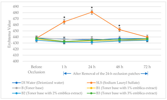 * indicates statistically significant differences between erythema index before occlusion and after removal of 24-h occlusion patches (p < 0.05) for the same reagent (DI water = Deionized water (negative control), SLS = Sodium lauryl sulfate (positive control), B = Toner base, B1 = Toner base with 1% emblica extract, B2 = Toner base with 2% emblica extract, B3 = Toner base with 3% emblica extract).