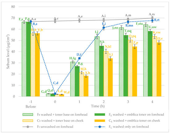 Sebum level on forehead and cheek skins of 30 volunteers at different periods. Different capital letters (A–Z,Ω) indicate statistically significant differences (p < 0.05) in the same treatment among different periods. Different lower case letters (a–w) indicate statistically significant differences (p < 0.05) in the same period among different treatments.