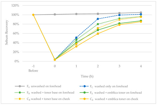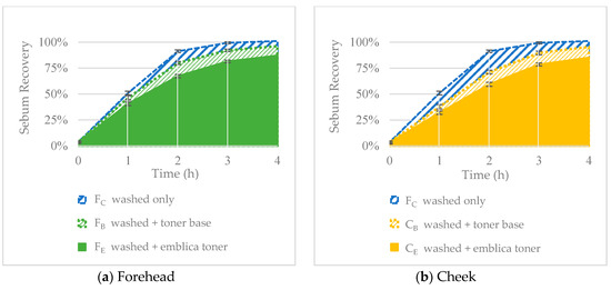 The sebum recovery changed over time corresponding to the trend of sebum level, and it was found that, at the end of the 4 h experiment, the sebum recovery on the facial skin with either toner base or emblica toner applied was lower than that on the washed-only position. Therefore, it has been shown that the toner base and the emblica toner may reduce the sebum recovery. Moreover, the change was not linear; therefore, for this study, the area under the curve of the sebum recovery was calculated by comparing the area under the curve of the sebum recovery between the skin position that was washed and the toner applied, and the position that was washed only (the control treatment) in the same period and condition, which reduced the impact of confounding factors such as ambient temperature, humidity, daily rhythm, and hormonal balance [32].