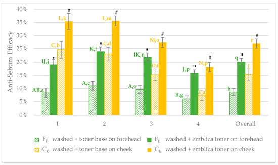 Anti-sebum efficacy of the emblica toners on forehead and cheek skins of treatment compared with the toner base in different periods of 30 volunteers. ” indicates statistically significant differences between the anti-sebum efficacy of emblica toner and that of toner base in the forehead area in the same period (p < 0.05). # indicates statistically significant differences between the anti-sebum efficacy of emblica toner and that of toner base in the cheek area in the same period (p < 0.05). Different capital letters (A–E,I–N) indicate statistically significant differences (p < 0.05) in the same position between periods of 1, 2, 3 and 4 h. Different lower case letters (a–i) indicate statistically significant differences (p < 0.05) in the same period between forehead and cheek with the toner base applied. Different lower case letters (j–r) indicate statistically significant differences (p < 0.05) in the same period between forehead and cheek areas with the emblica toner applied.