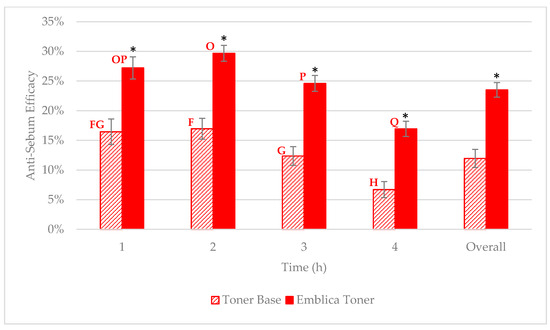 Anti-sebum efficacy of the emblica toners of treatment compared with the toner base at different periods of 30 volunteers. * indicates statistically significant differences between the average anti-sebum efficacy of emblica toner and that of toner base in the same period (p < 0.05). Different capital letters (F,G,H) indicate statistically significant differences (p < 0.05) in the treatment with the toner base between periods of 1, 2, 3 and 4 h. Different capital letters (O,P,Q) indicate statistically significant differences (p < 0.05) in the treatment with the emblica toner between periods of 1, 2, 3 and 4 h.
