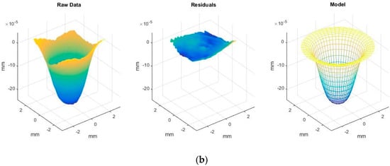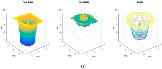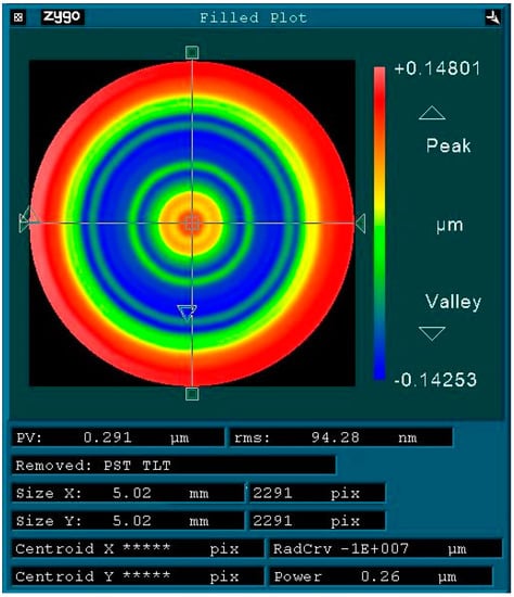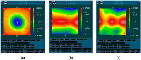 For example, if we compare the results of the TIF mathematical fitting obtained by the Zeeko Precessions software for the FEM tool spot and for the VEH tool spot generated in dynamic mode with sequential tilting 15° in the +X, +Y, −X, and −Y axes, there was a significant reduction in the residual error of the TIF (Figure 7). This suggests the possibility of more accurate control of the dwell time corrective process.