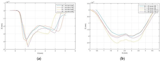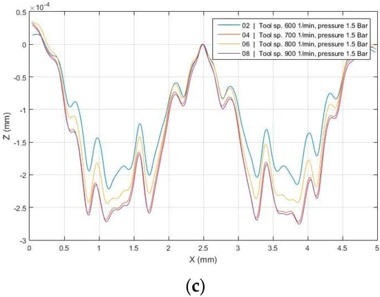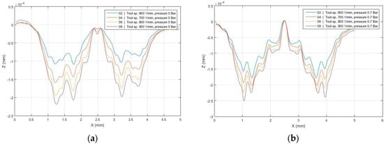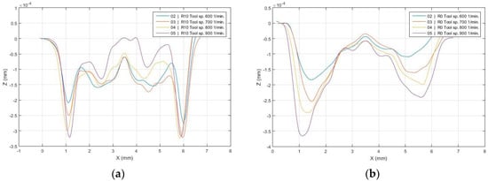 Two variants were tested for the VEH tool: a tool with a radius of R10 and a tool into whose head a planar surface with a diameter of 5.5 mm had been machined for the purpose of gluing on the polishing pad (R0). From the experiments performed (Figure 5), it was evident that in all cases, material removal increased when the tool speed rotation increased; however, this had no effect on the final shape of the polishing spots. Furthermore, in the case of the R10 spherical tool (Figure 5a), the material was polished out primarily by a very narrow ring, as the central part of the tool nearly failed to remove the material due to low circumferential speed and low polish penetration. The interaction between the pressure, the circumferential speed, and the distribution of the polishing slurry then resulted in the observed undulation, which was unsuitable for mathematical modeling of TIF using the Gaussian function.