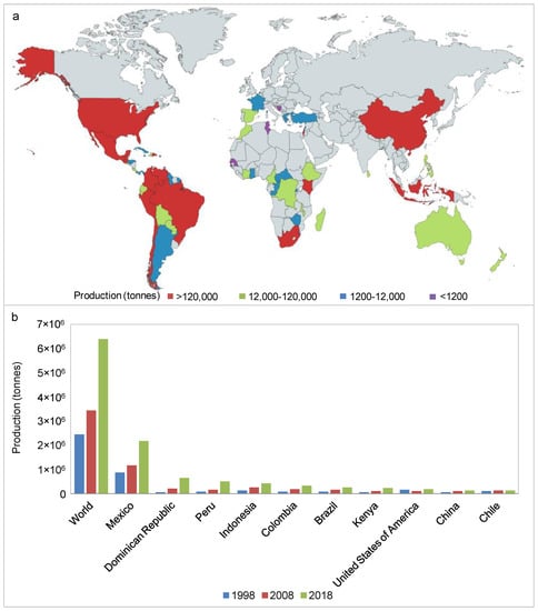 The avocado (Persea americana Mill.) is a tree native to Mesoamerica, whose origin is in the central part of Mexico and some parts of northern Guatemala. The name of the avocado comes from Nahuatl (Ahuacatl), a word that means “tree testicles” []. Avocado belongs to the family Lauraceae []. The Lauraceae family is one of the oldest among the flowering plants; particularly, avocado is the most important and only edible fruit of this family and has a high commercial value [,,]. Production areas were concentrated in Central and South America, but it is currently cultivated worldwide. Avocado consumption is growing everywhere, and it has caused a large number of countries to invest heavily in avocado production (Figure 1a). Based on the average production between 1998 and 2018, the top 10 avocado producing countries were firstly México, followed by the Dominican Republic, Indonesia, Colombia, United States, Peru, Brazil, Chile, Kenya, and China []. Figure 1b shows the production of avocados in these top 10 countries in 1998, 2008, and 2018. It highlights that Mexico is the major producer and the production was generally increased not only in this country but also in all these countries. In 2018, the world’s avocado production was around 6.4 million tons, of which these countries produced 77.4% [].