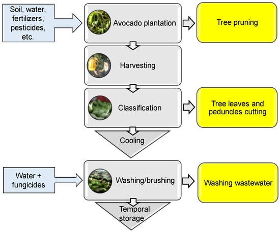 Throughout the avocado value chain, from tree planting to industrialization, there are stages where different types of biomass are generated and they can be recycled as resources in a biorefinery. The activities prior to industrialization are planting, harvesting, selection, cooling, washing/brushing, packing, and temporary storage [] (Figure 3). In the traditional plantation system, trees are planted with distances of 10 × 10 m between them, so that the tree grows up to 8 or 10 m high and the density is around 117 trees per hectare. In the orchards, the tree grows up to a maximum height of around 3 m to facilitate the practices of phytosanitary control, harvesting, foliar fertilization, and cutting. This enables plantation distances of 6 × 3 m or up to 3 × 3 m, increasing the density to 300 and up to 1000 trees per hectare [,]. Accordingly, maintenance pruning practices results in a big amount of biomass (branches and leaves) that must be removed from the fields to avoid propagation of plant diseases. One sustainable alternative is to use it for compost, although in most occasions these residues are burned.