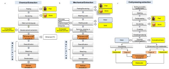 Chemical (a), mechanical (b), and cold-pressing extraction (c) of avocado oil and the by-products/waste obtained (yellow squares).