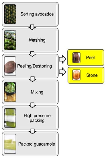 Another star product of the avocado is guacamole, whose production process (Figure 5) consists of the selection of ripe avocados, washing, and, as for the extraction of oil, removing the peel and stone to recover the pulp. Then, it is mixed with others elements (onion, tomato, and salt, basically) to finally obtain the guacamole, which is packaged [].