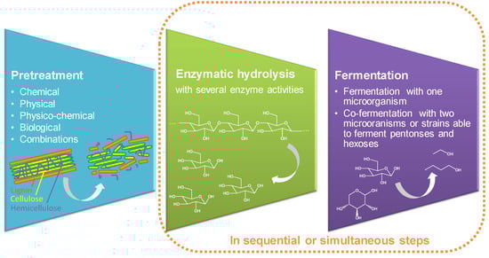 In this regard, to obtain bioethanol, different process configurations, including the aforementioned pretreatments, enzymatic hydrolysis, and fermentation conditions, are applied (Figure 7). Concerning fermentation, Saccharomyces cerevisiae is mainly utilized to convert glucose into ethanol, while microorganism such as Pachysolen tannophilus can ferment pentoses to ethanol and xylitol []. In co-fermentation approaches, some ethanologenic Escherichia coli strains and Pichia stipitis can ferment xylose and glucose to ethanol, while the combination of microorganisms is also plausible [,,].