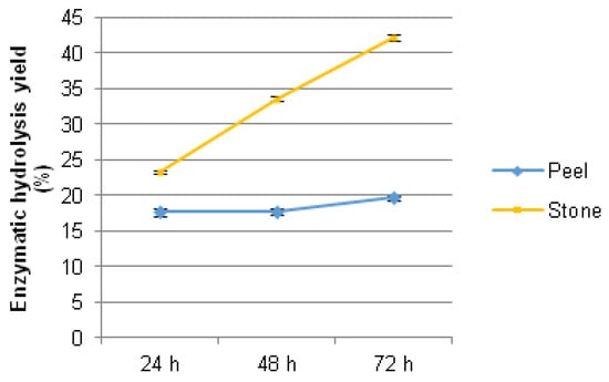 Moreover, the application of avocado stone starch for second generation bioethanol is interesting after its conversion into free glucose [], but limited works are available, as commented on before. Our preliminary results show that avocado stone (dried and milled), can release glucose in relatively high amounts (>40% of the initial glucose in the raw biomass) by enzymatic hydrolysis with Cellic® CTec2 and β-glucosidase for 72 h (Figure 8; see also Supplementary Files). This value is higher than that for the peel and other agri-food residues [,], probably due to its starchy or highly available characteristics.