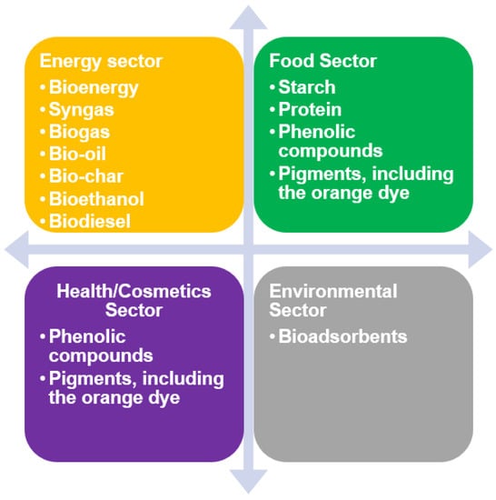 In addition to the aforementioned applications, avocado by-products contain other macrocomponents that can be used in the food sector or for bioenergy purposes. In this sense, the avocado stone presents starch, as commented on before. Although some authors reported values up to 30% [], specific enzymatic methods should be applied to determine its content in future studies (e.g., https://permanent.fdlp.gov/LPS94088/42624.pdf).