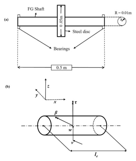 The finite element formulations have been developed using Timoshenko beam theory (TBT) for natural frequency analysis of porous and nonporous FG rotor systems. A two-noded porous FG shaft element stiffness and mass matrices are derived in this work, and is, to the best of the authors’ knowledge, not available in the literature. The effects of rotatory inertia, gyroscopic moments, elastic bending energy, translational kinetic energy, and transverse shear deformation are included in shaft element modelling. A typical FG rotor–bearing system is shown in Figure 3a. A uniform steel disc is located precisely at the mid-span of the shaft and the ends of the shaft are supported on linear bearings. The component equations of motion of the FG rotor system are discussed in the following Sections (Section 3.1, Section 3.2 and Section 3.3).