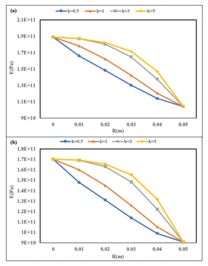 Power law gradation and NLTD method are used to obtain the material properties as a function of the radius and temperature of an FG shaft. The variation in the computed Young modulus of the FG (SS-ZrO2) shaft due to the radial distance is shown in Figure 4b. The computed values are in good accordance with the literature [28].