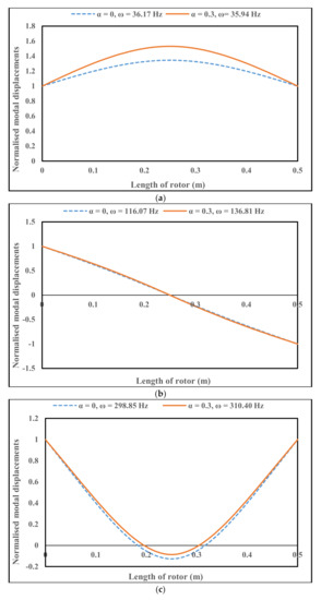 The first, second and third mode shapes of porous and non-porous FG rotor–bearing systems are plotted in Figure 6a–c for volume fractions of porosity, α = 0.3 and a power law index of 0.5. The dotted line represents the modal displacement curve of a non-porous FG rotor–bearing system, whereas the solid line represents the modal displacement curve of a porous FG rotor–bearing system. The plotted graphs are as expected and can be compared with the mode shapes of rotors with intermediate bearings described in the literature [47]. The natural frequencies corresponding to each mode shape are given in Figure 6a–c.