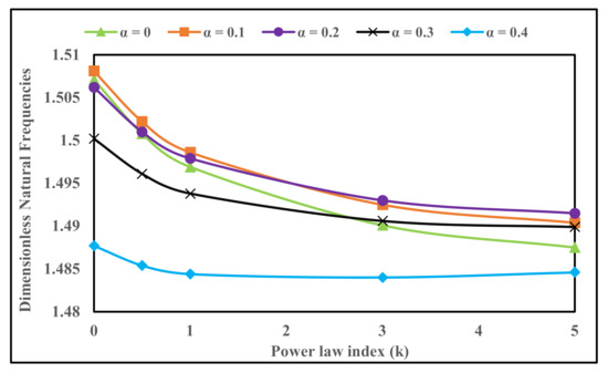 Figure 8 shows the variation in DNFs against the power law index for different volume fractions of porosity. It has been observed that the DNFs reach their maximum at k = 0. Since the FG shaft is completely composed of ceramic at k = 0, the ratio of Young’s modulus to the density of a ceramic is high. However, the DNFs of the system decrease with the increase in the power law index. As the power law index increases from zero to five, the composition of the FG shaft alters from an absolute ceramic to an FG shaft that is comprised of a combination of metal and ceramic. The percentage of metal increases in the FG shaft and hence the ratio of Young’s modulus to the density decreases. Eventually, the DNFs of the system are reduced. DNFs with volume fractions that have porosities (α) = 0.1, 0.2 are slightly higher than the DNFs without porosity. This is due to the fact that the reductions in the material properties lead to an increase in the ratio of stiffness and mass as compared to the ratio of the FG shaft without porosity.