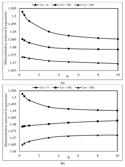 The variation in DNFs with the power law index of an FG rotor system with and without porosity for different thermal gradients is plotted in Figure 9a,b. Dimensionless natural frequencies decrease with the increase in the temperature gradient, as expected. This is due to the reduction in material properties, especially Young’s modulus, at higher temperatures. However, the presence of porosities in the FG shaft result in a reduction in Young’s modulus and other material properties, which would lead to the abrupt drop in the DNFs at high temperatures (Toi = To − Ti = 300 or 600). Later, the DNFs slightly increase initially with the power law index (k), but the surge in DNFs eventually becomes barely detectable.