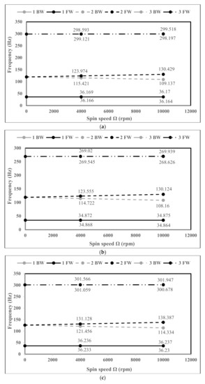 Backward and forward whirl (BW and FW) frequencies of a steel double-disc rotor.