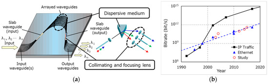 Long-haul traffic has grown owing to the contribution of AWGs in DWDM line-side networks. However, data traffic in shorter reaches is becoming more and more important recently. The global trend in data traffic is summarized in Figure 1b. The solid line (black) represents data traffic on a logarithmic scale [11]. Since the remarkable increase after the millennium, traffic has continuously increased and will reach petabits per second soon after 2020. In the meantime, client-side interfaces have also progressed exponentially. The triangles and dashed line (blue) are the standardization year and extrapolated Ethernet growth, respectively, which indicate that Ethernet speed has increased by a factor of ten within about a seven-year period. The 100-gigabit Ethernet (100 GbE) and beyond have been standardized since 2010. Based on current technology trends, client-side networks such as those used in datacenters and for mobile links with the reach of 100 km or less will consume more data for local wireless traffic with the advent of self-driving vehicles, edge computing for artificial intelligence, and automation with the Internet-of-Things (IoTs). These developments will require real-time operation without latency, ensured security, and event-driven data processing. Accordingly, future networks should not only be cloud storage-based but also have distributed computing edges to accommodate a variety of data protocols other than TCP/IP. Toward the realization of such data-centric communications and computing, photonics technology will play a more important role in overcoming electronic limitations on operating frequency and power consumption, referred to as Moore’s law [12]. In particular, wavelength scalability and functionality through multi-wavelength integrated devices will be a key to promoting the spread of future innovative all-photonic networks [13].