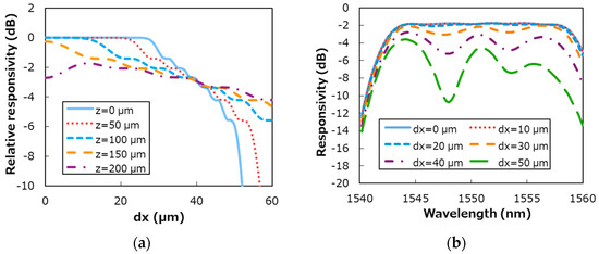 Optical coupling between MM-AWG and photodiode (PD). The design condition is based on a silica PLC for the 1.5-μm band with an index difference by 0.75%. The diameter of the PD is 80 μm. (a) Calculated relative responsivity of optical coupling for the highest mode. The parameter z is the distance between the edges of MM-AWG output, and dx represents displacement from the center. (b) Measurement results of spectrum shape by offset dx at z = 150 μm.