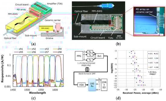 A photograph of the fabricated photoreceiver is shown in Figure 5b. The MM-AWG was fixed at the center of the aluminum sub-mount. A circuit board with TIAs was also mounted on the sub-mount. The eight-channel silica-based MM-AWG had the index difference between the core and cladding of 0.75%, and the cores of the input and output waveguides are 6 × 6 and 6 × 30 μm in size, respectively. The eight-channel PD array consists of InGaAs pin-PDs on a ceramic carrier. Each PD has a responsivity of over 1 A/W. The signal output from the PD array was fed into electrical transmission lines on the ceramic carrier followed by the TIAs via bonding wires. The size of the package is 100 × 50 mm.