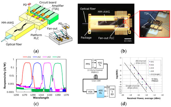 As mentioned before, WDM is more important in client-side optics. Currently, for instance, WDM-based Ethernet specifications have already been standardized for 40 and 100 Gb/s and beyond [25,26]. As the client-side demultiplexer, free-space optics with thin-film filters (TFFs) has been used, especially in coarse WDM (CWDM) systems with a small number of wavelengths [27,28]. However, this optics has drawbacks. One is the need for complex and precise assembly in building an optical block using TFFs and collimating lenses. Furthermore, it is more difficult to configure for denser or larger-scale WDM. Hence, an alternative demultiplexer based on a PLC is a very promising candidate, which has also been widely implemented in optical transceivers. In our study, we used the MM-AWG, a low-loss flat-top demultiplexer, to build WDM photoreceivers with total bit rates of 10, 40, 100 Gb/s, and beyond.
